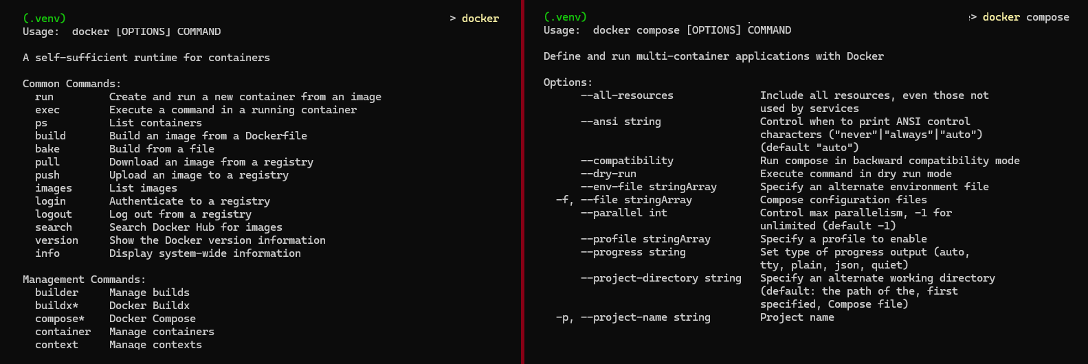docker and docker compose commands. These commands display a list of available options and subcommands that you can use to interact with Docker.