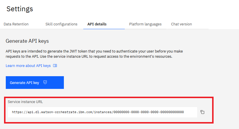 The watsonx Orchestrate service instance URL.To obtain the service instance URL, follow these steps: