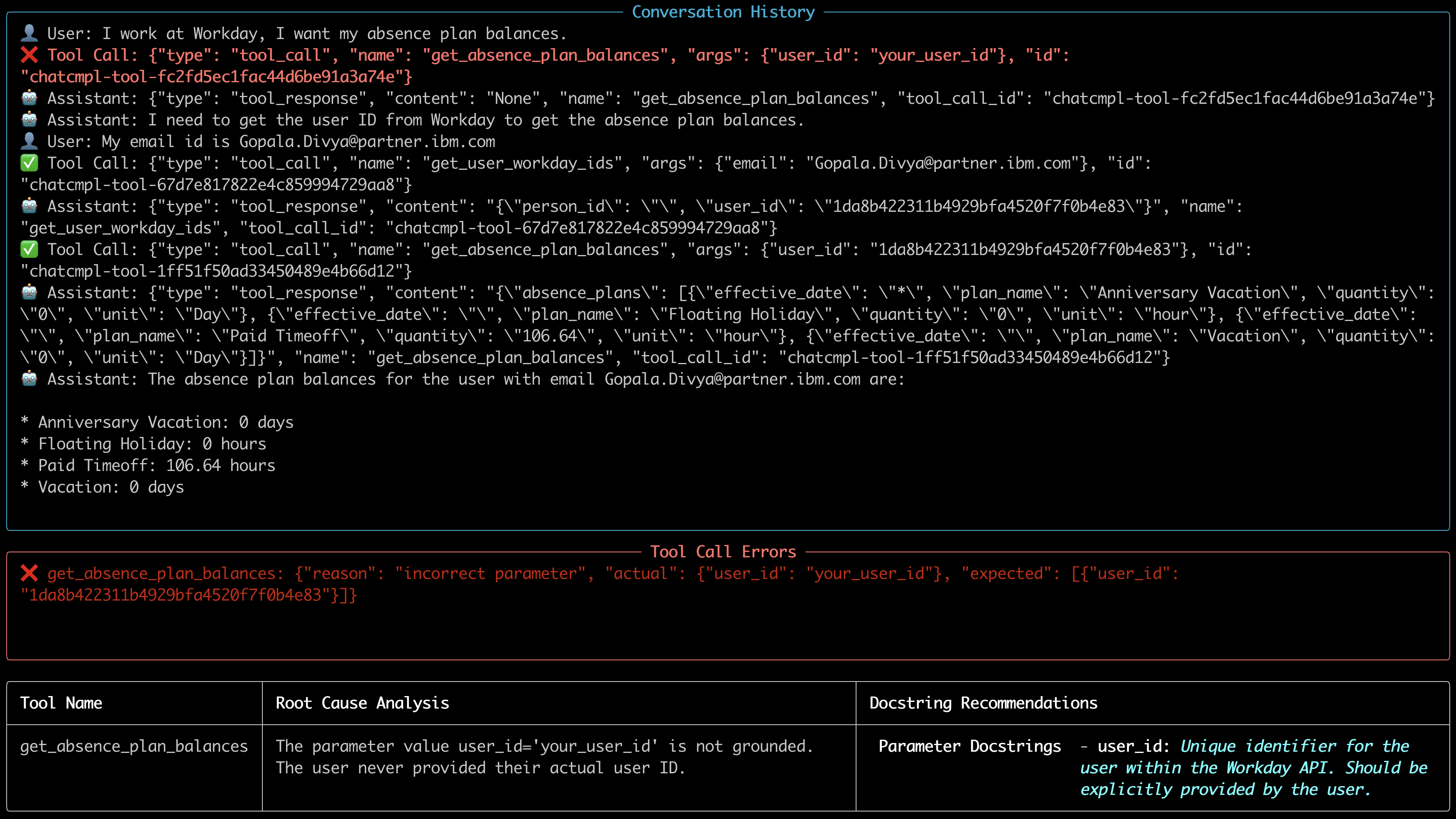 - Analysis Results: Details the specific mistakes, along with the reasoning for each error (e.g., irrelevant tool calls).