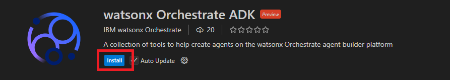 Click on the watsonx Orchestrate ADK extension from the results and click Install.