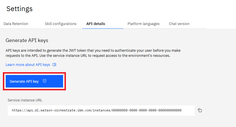The watsonx Orchestrate API key.To obtain the API key, follow these steps: